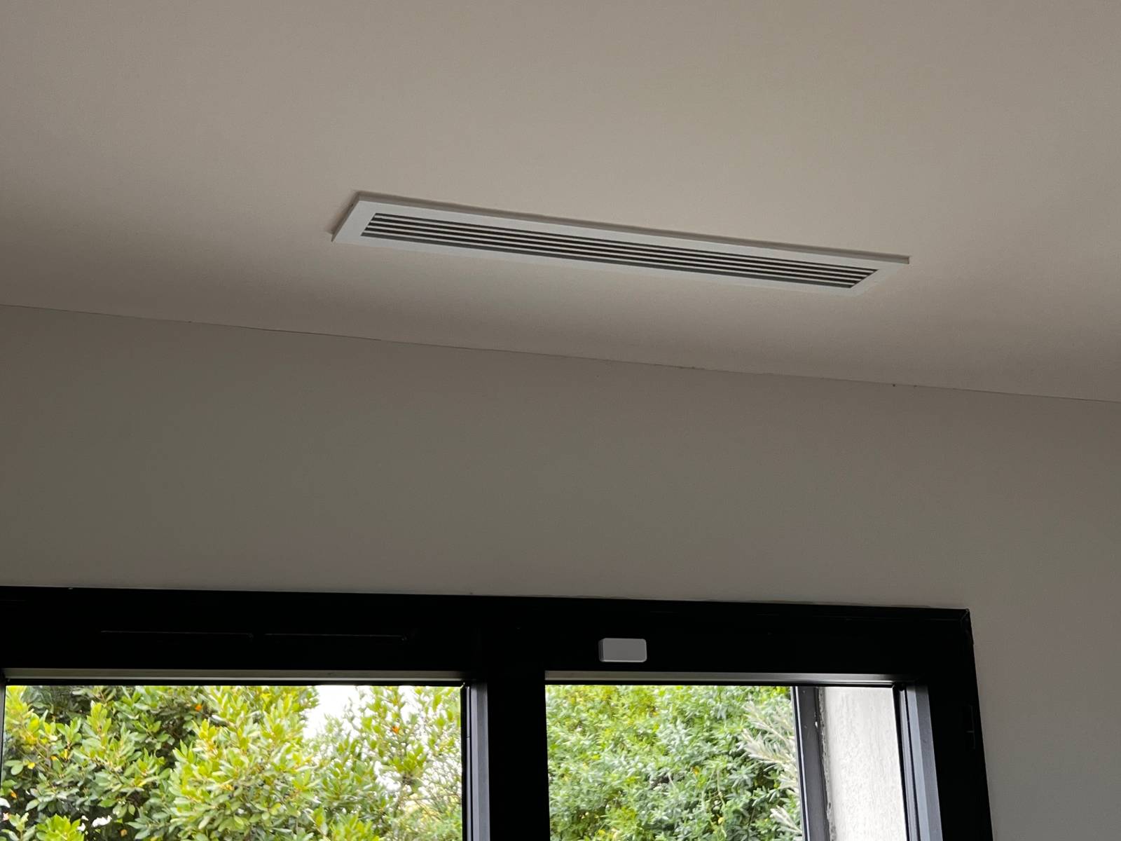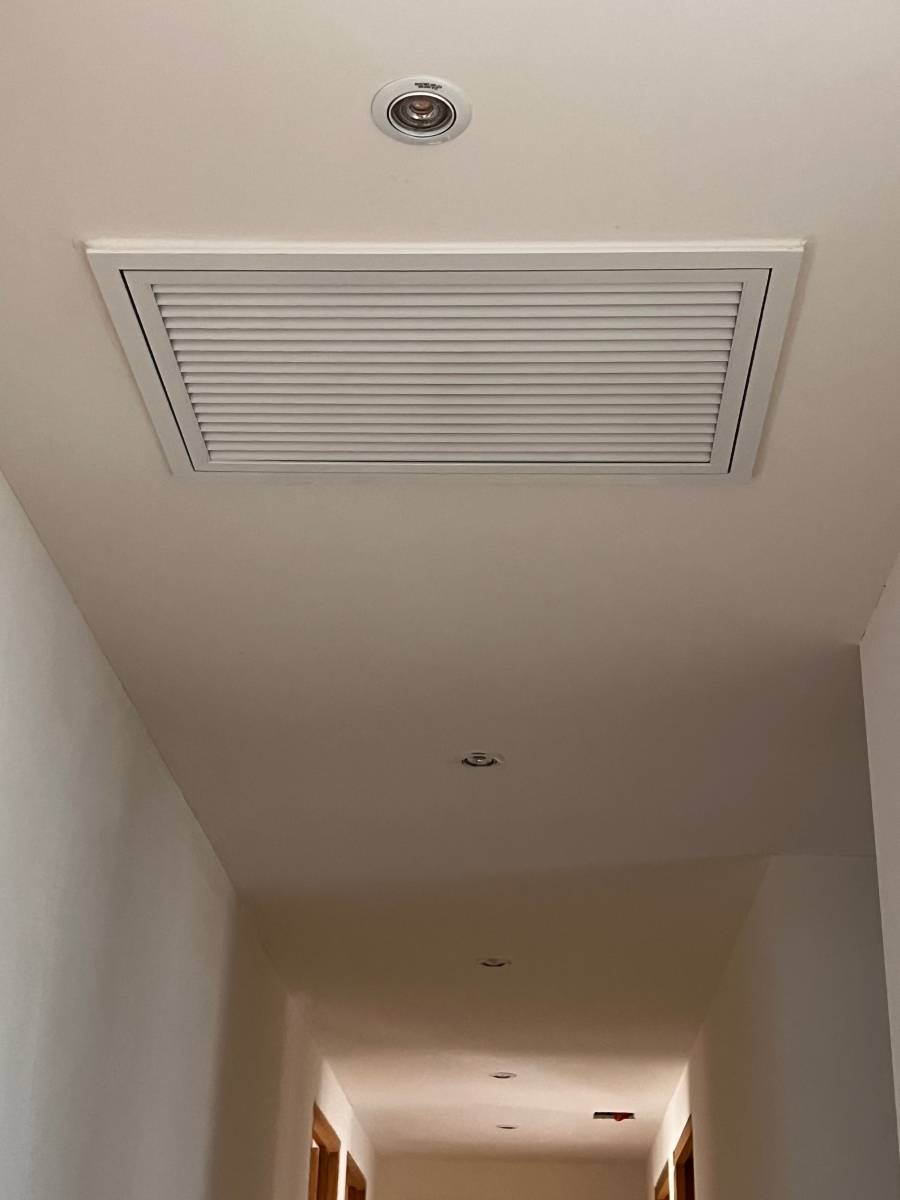 Dans cette maison , les gaines ont été placées en faux plafond du couloir, et l'unité intérieure a été installée dans le faux plafond de la salle de bain .